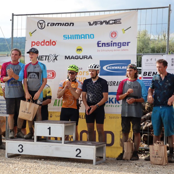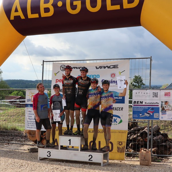 Einiges neues gab es bei der diesjährigen Alb Gold Trophy am 07.07.2024. Der Termin wurde vom Herbst in den Juli verlegt, Start- und Ziel waren dieses Jahr am Sitz des Hauptsponsors am Alb Gold Zentrum bei Trochtelfingen. Auch das Generationenrennen bei der Trophy war für uns neu, ist aber gut angekommen. Mit 5 Teams, bestehend aus Levin und Daniel Adis, Xaver und Daniel Heuberger, Manne und Bruno Staigle, Melanie und Theo Staigle sowie Fabienne und Alexander Eissler ist der RV hier an den Start gegangen. Nachdem es kurz vor dem Start noch geregnet hatte, blieb es beim Rennen zumindest von oben trocken. Nach 30 Kilometern mit rund 500 Höhenmetern über die Alb kamen alle Teams dreckig aber glücklich wieder ins Ziel. Beim Minimarathon auf der gleichen Runde wie das Generationenrennen starteten Benjamin Leins und Maximilian Eissler, er musste aber das Rennen mit einem technischen Defekt bereits nach einem Kilometer leider aufgeben. Beim Single Marathon ging Timo Henne für den RV ins Rennen. Zum Abschluss ließ sich bei der Siegerehrung dann doch noch die Sonne blicken und sorgte für einen schönen Abschluss des Tages.