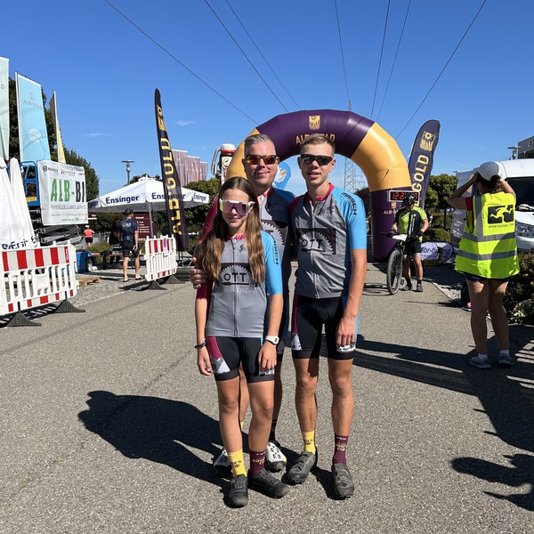 Einen Spätsommertag, wie man ihn sich für einen Wettkampf nicht besser wünschen könnte, hatten wir am 20.09.2025. Bei der diesjährigen Alb Gold Trophy mit Start und Ziel am Alb Gold Kundenzentrum in Trochtelfingen waren vier Teams beim Generation Race und ein Einzelfahrer auf der Single Distanz vom RV am Start. Um 9:35 Uhr wurden wir gemeinsam auf die rund 30,5 km und 460 Höhenmeter lange Strecke geschickt. Maximilian konnte sich beim Start an die Spitzengruppe hängen. Während des Rennens konnte er das Tempo der Spitze nicht ganz mitgehen, aber im Verfolgerfeld bleiben. Knapp 6 Minuten hinter dem Gesamtsieger kam er nach 1 Stunde, 6 Minuten und 25 Sekunden auf dem elften Platz der Gesamtwertung ins Ziel. In der Kategorie U17 männlich musste er sich nur einem Fahrer geschlagen geben und erreichte einen starken zweiten Platz. Auf der gleichen Strecke waren auch unsere vier Teams unterwegs. Das erste Team vom RV, dass das Ziel erreichte, waren Fabienne mit Papa Alexander. Nach 1 Stunde 30 Minuten und 24 Sekunden hieß es für Sie Platz 8 in der Teamwertung. Fabienne war somit auch das schnellste Mädchen beim Generation Race. Und 7 Minuten später erreichen Levin mit Papa Daniel auf dem zwölften Platz das Ziel. Ebenfalls 7 Minuten danach sicherten sich Xaver mit Mama Verena den 14. Platz. Das gute Ergebnis rundeten mit dem 19. Platz Theo mit Papa Peter nach 2 Stunden Rennzeit ab. Herzlichen Glückwunsch an alle Starter!